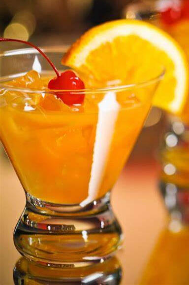 Garnished with Orange Peel and cocktail cherries.